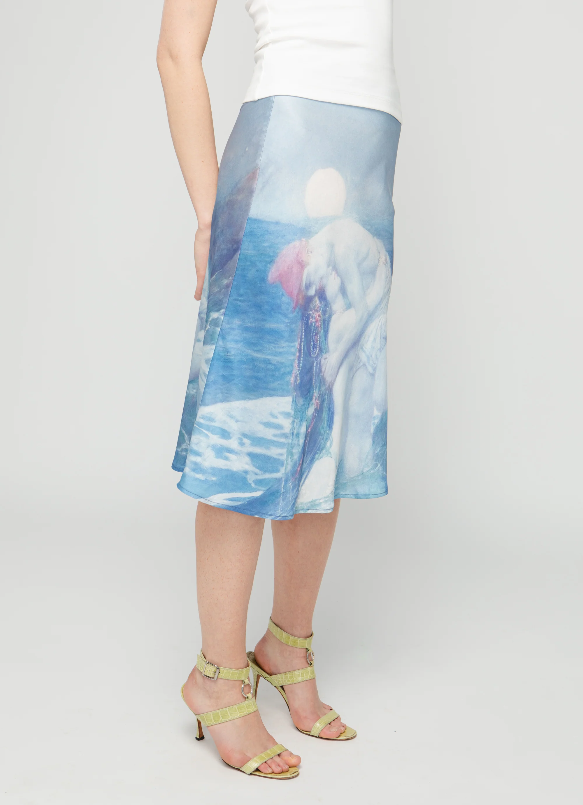 A mid-rise A-line satin skirt that floats around you with every movement. Printed with our starcrossed ocean lovers and finished with an invisible zip at side. Size up for this piece to sit lower on the hip.