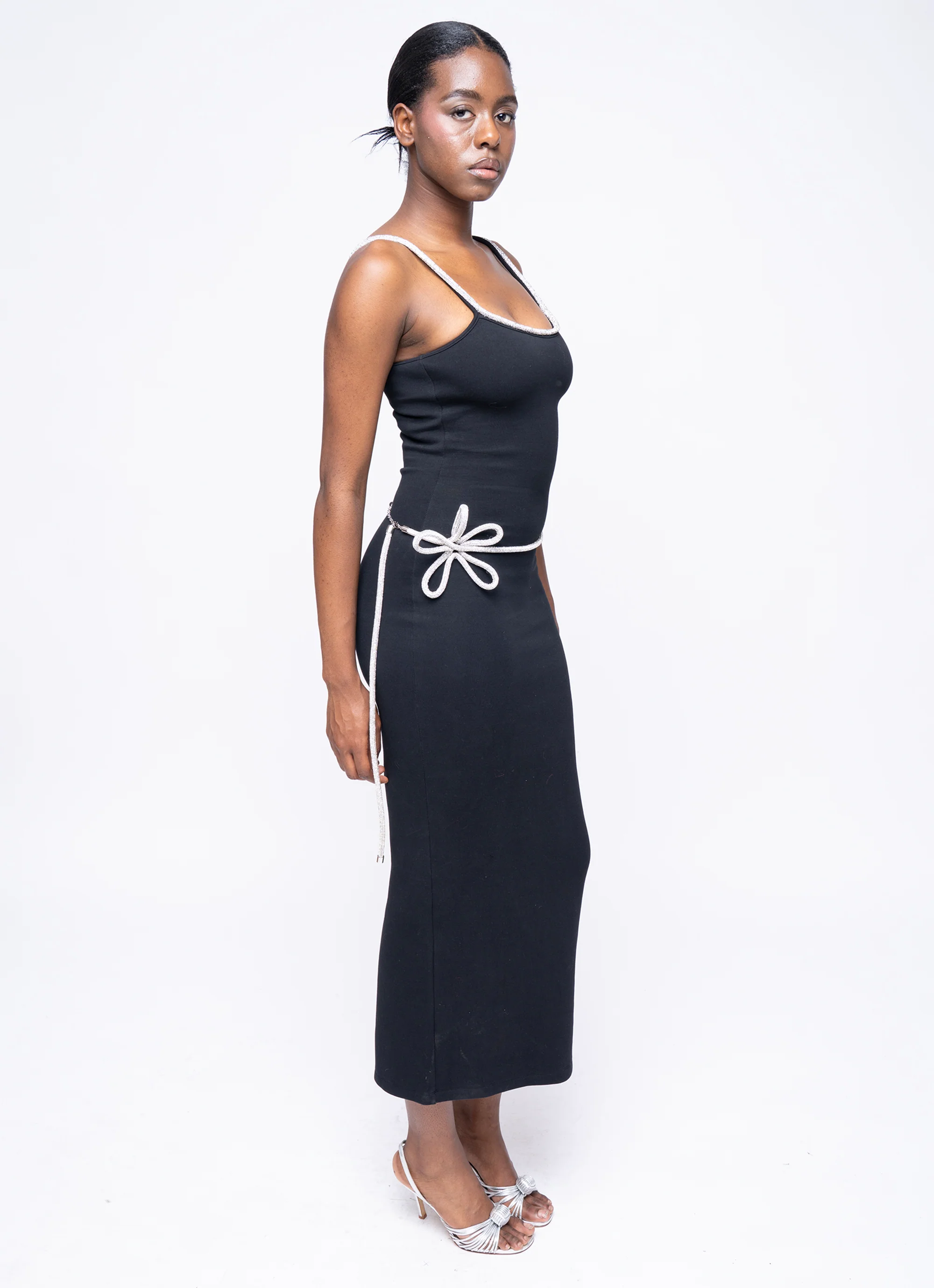 Designed to dazzle, this dress features rhinestone cording tracing your neckline and a detachable flower belt at the hip. A smooth and densely knit scuba jersey hugs the body and snatches you.