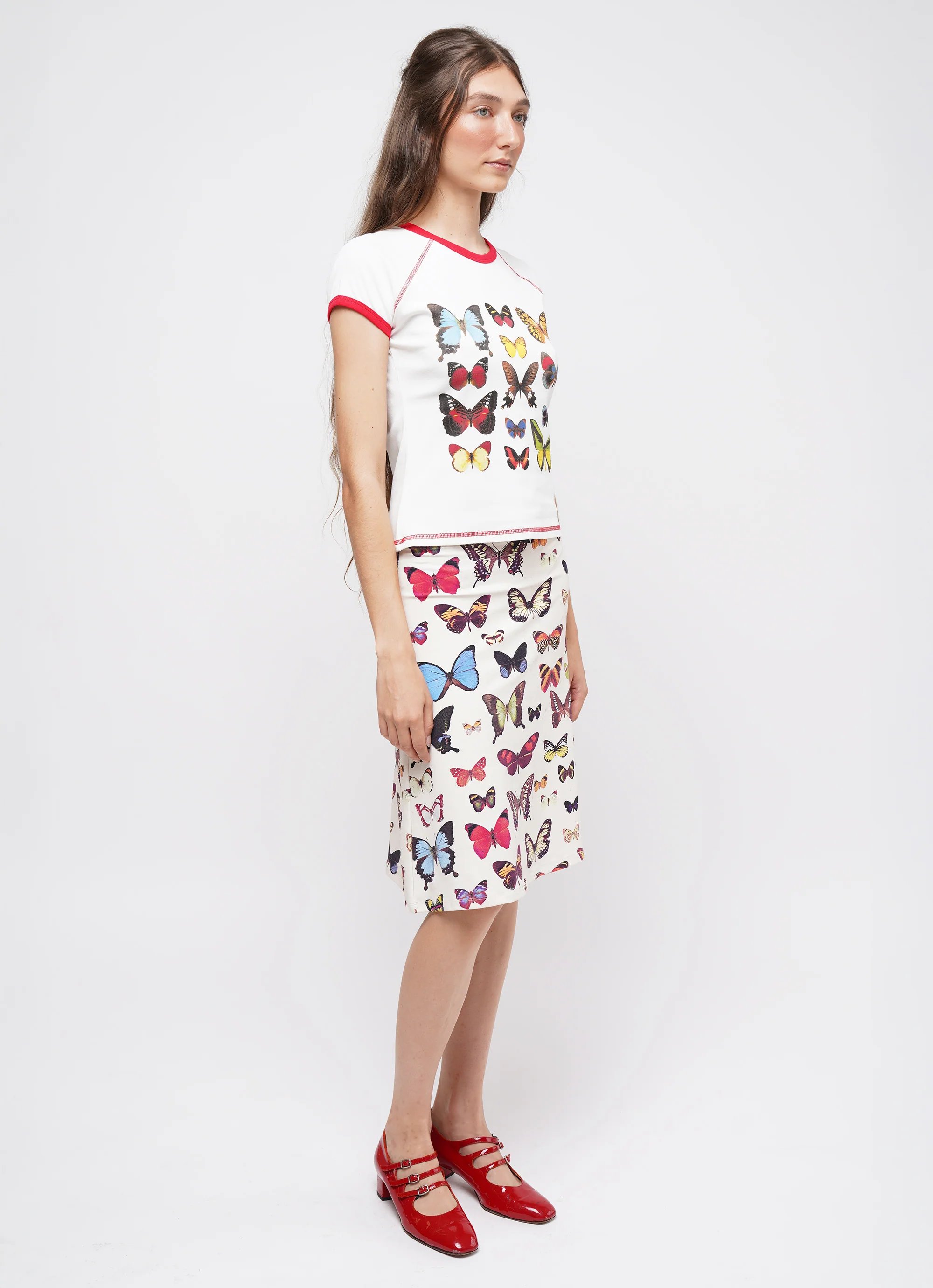 Our Collector Classic Tee in Shadow Box looks like you scored it at a vintage shop, but it’s brand new and actually fits perfectly. Slightly cropped, with red contrast binding and stitching, plus a lineup of colorful butterflies across the chest. The soft jersey hugs you just right, so even on lazy days with jeans, it still looks like you planned the perfect outfit.