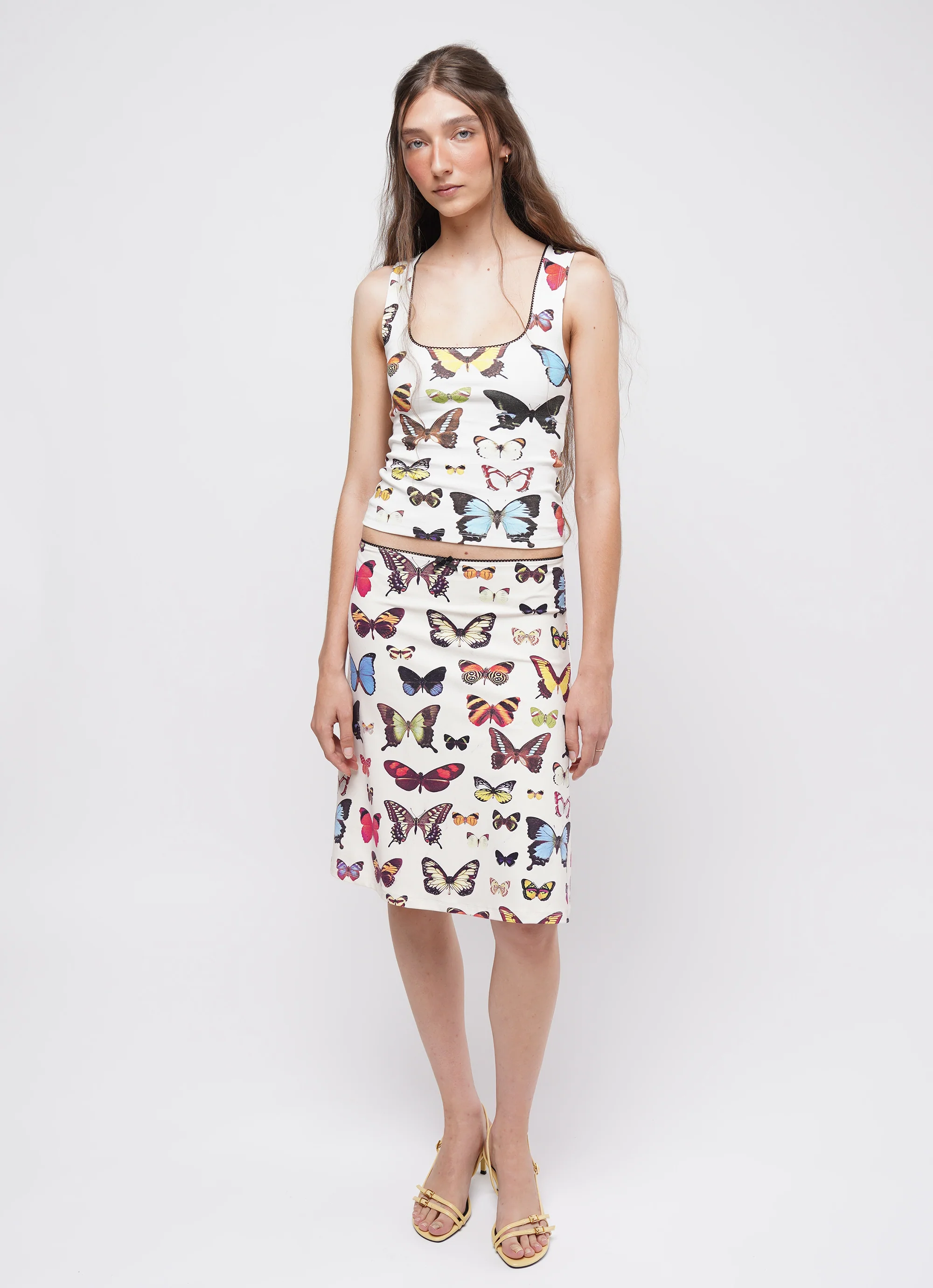 Our Collector Skirt might be the most flattering skirt in your closet. Curve-hugging with just the right flare at the hem, itβs made from our supportive jersey that moves with you. The Shadow Box version scatters butterflies across a creamy background. Wear it with a tee, a sweater, or the matching Collector Square Tank for a full set moment.