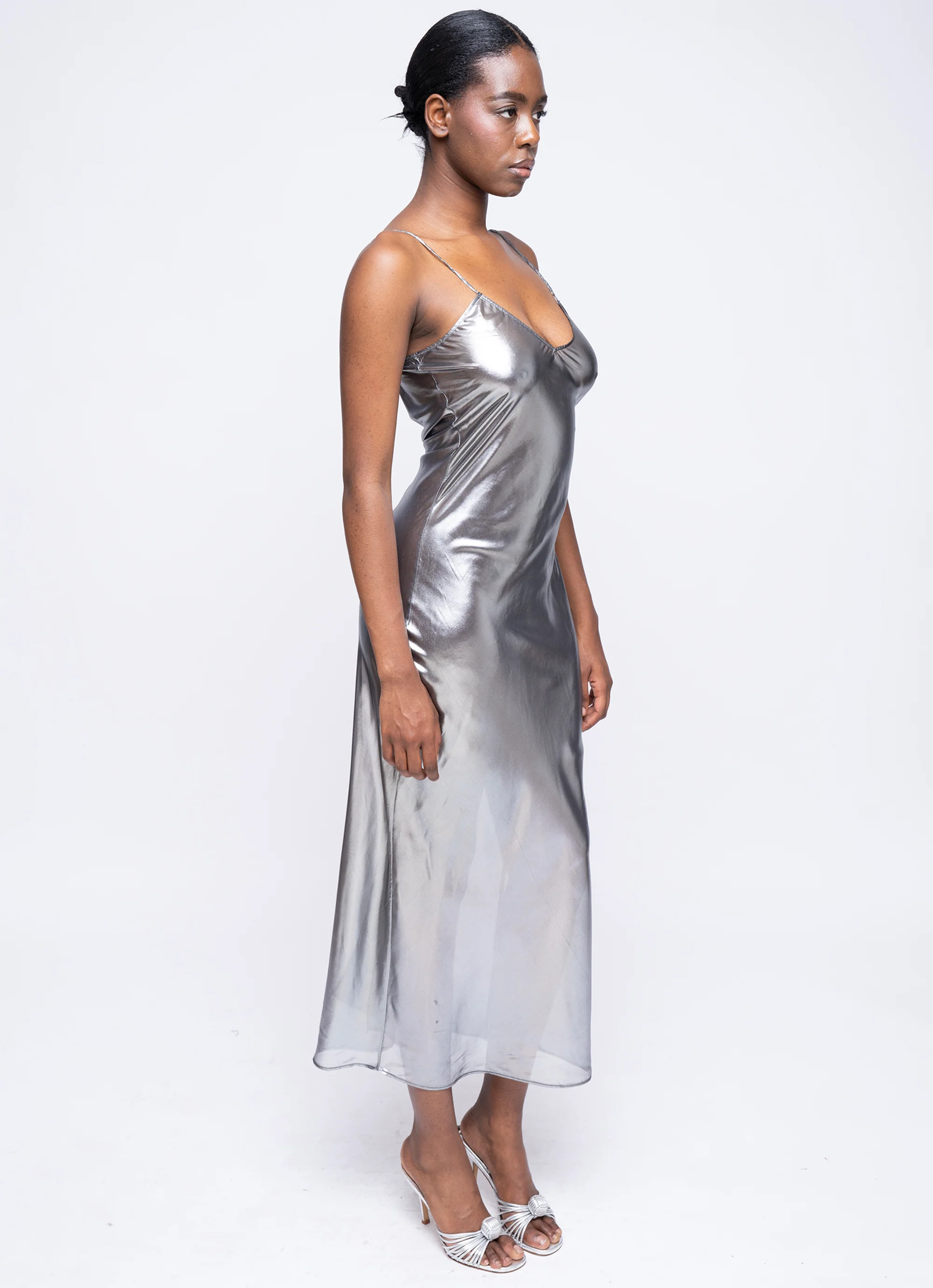 This incredible metallic silver catches the perfect amount of light. A full-length slip dress designed to be semi sheer but comes with a separate lining for when you feel like more coverage. Adjustable spaghetti straps that can be tied however you want at the back.