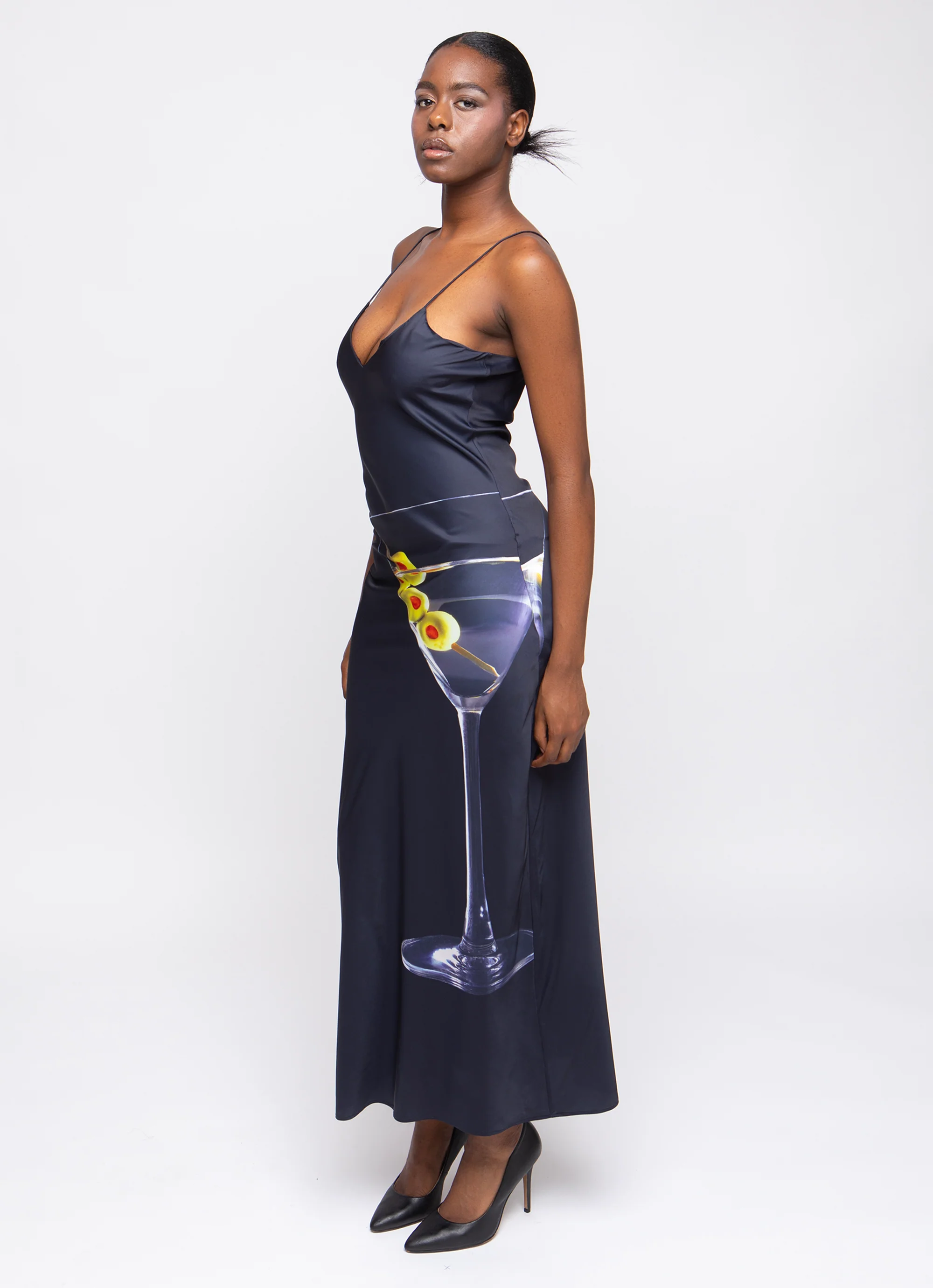 A full-length satin dress printed with a big, perfectly dirty martini. Cut for an A-line silhouette and designed to hug you through the body with the skirt flowing around you as you move.