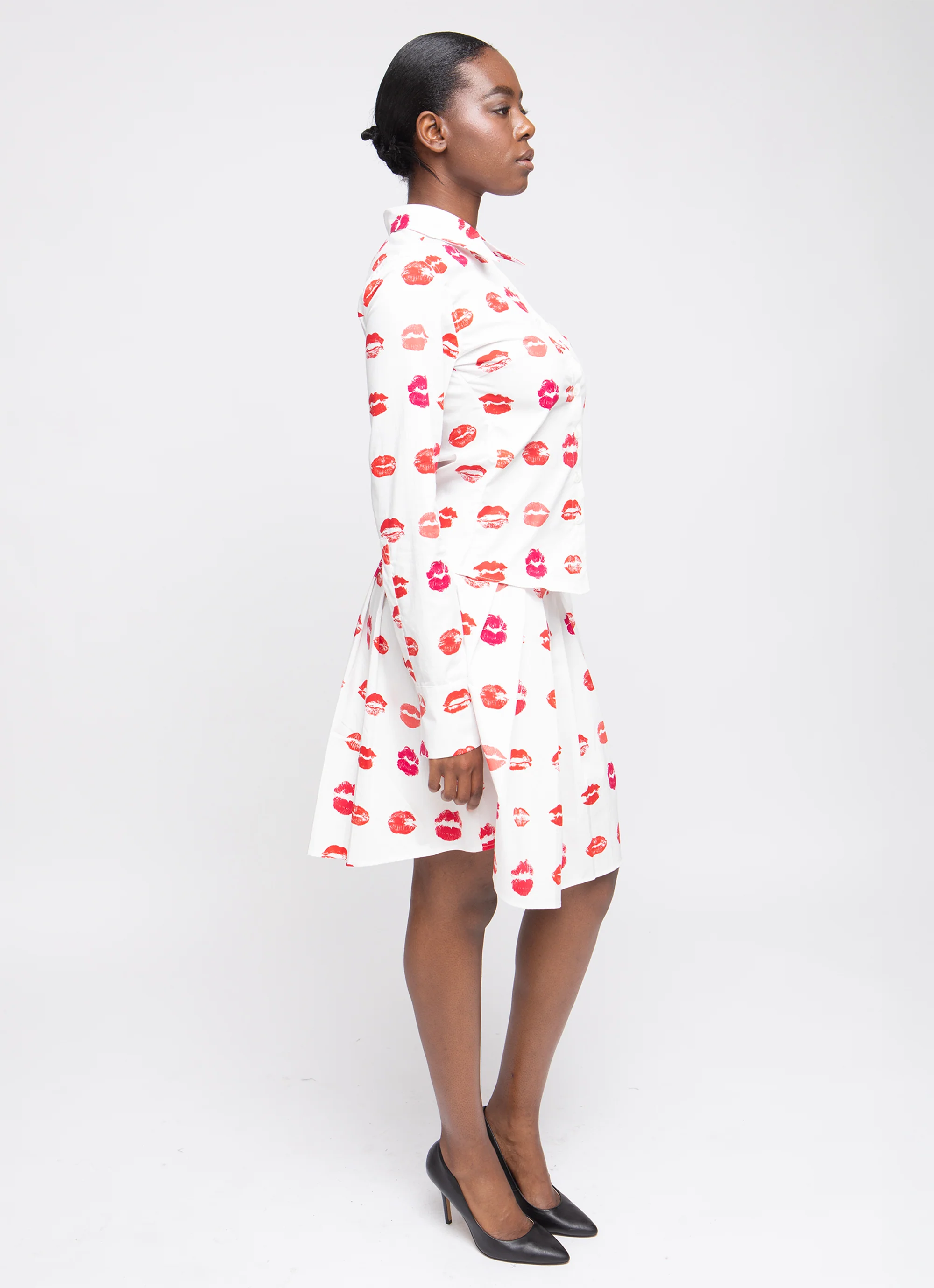 A pleated knee-length skirt cut in a structured pure cotton shirting and designed to sit on the hip for a classic silhouette. Inspired by lipstick stains on your napkin, this print is for when you want to be covered in kisses. Pair with the Lipstick Stains Button Down for the full runway look.