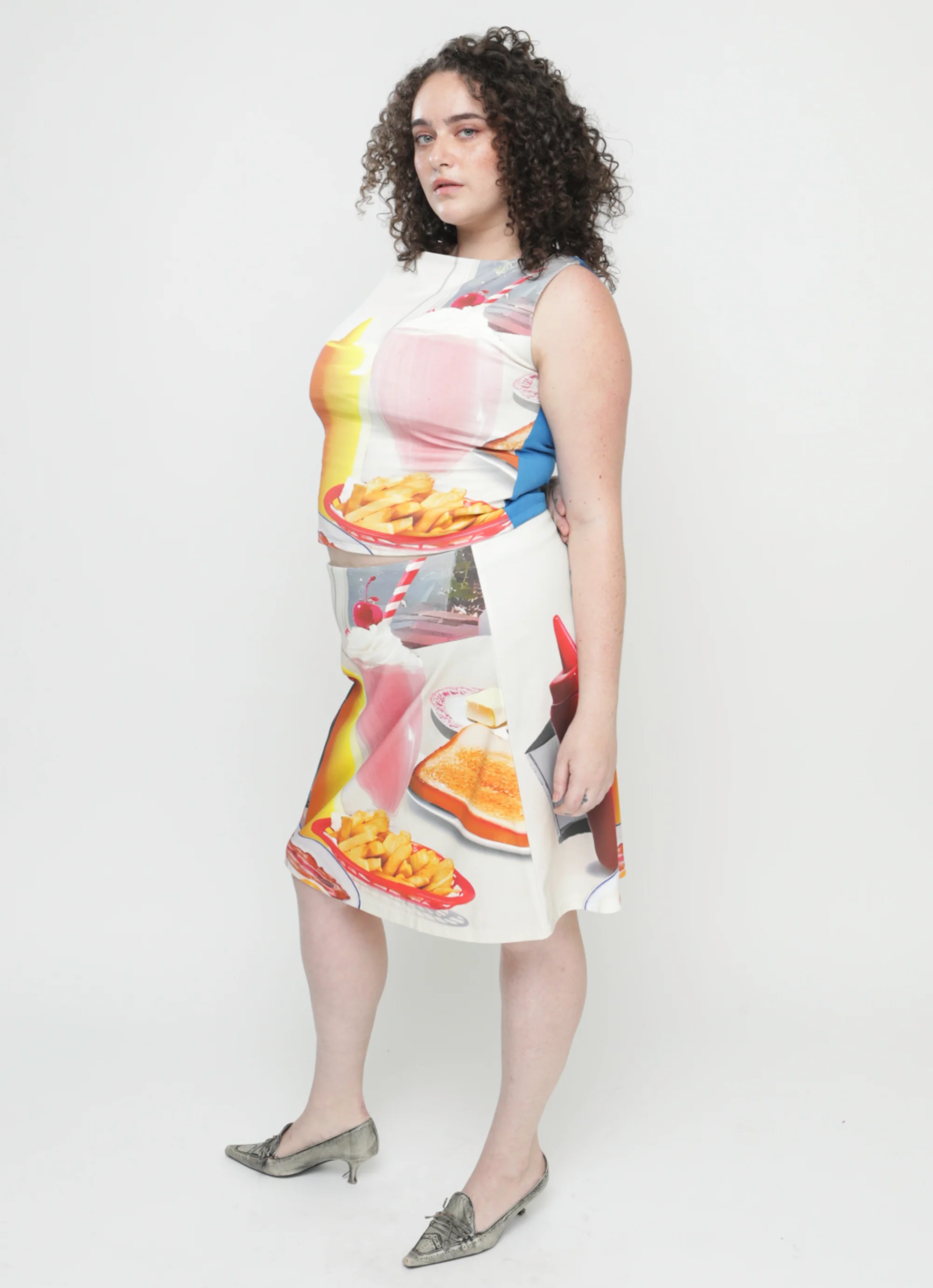 A picture perfect diner print with classic American favorites. The most comforting sunny print to take you from breakfast to late nights. Designed to sit on the hip with an A-line fit and cut in a soft, breathable cotton jersey.