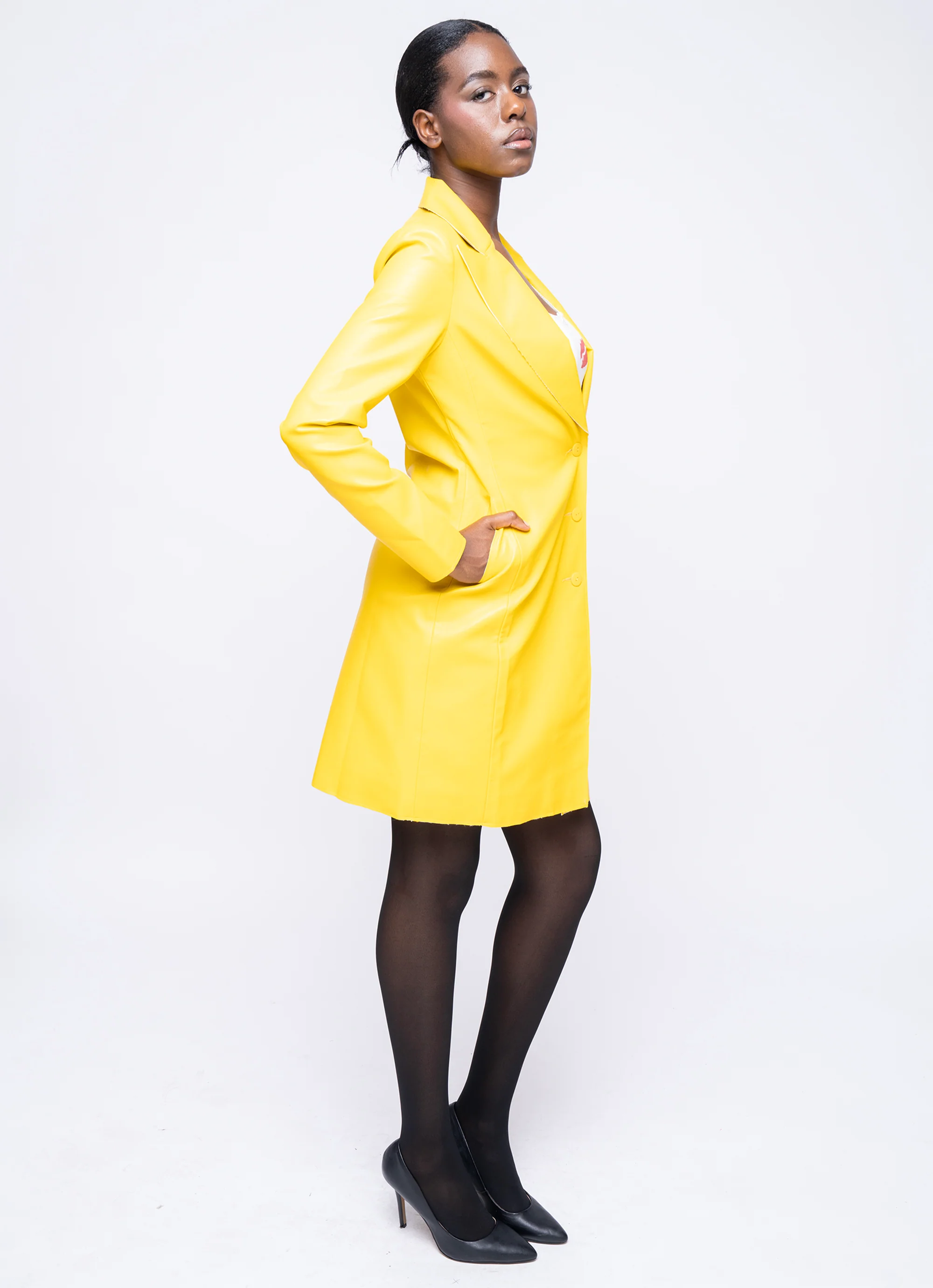 Ease into the colder seasons in the brightest possible way with our opening runway piece. Our Sloane Jacket is crafted in a soft, buttery viscose vegan leather and lined in sheer organza printed with our custom trash artwork. Classic single breasted cut with point collar and lapel and a tailored silhouette.Ā